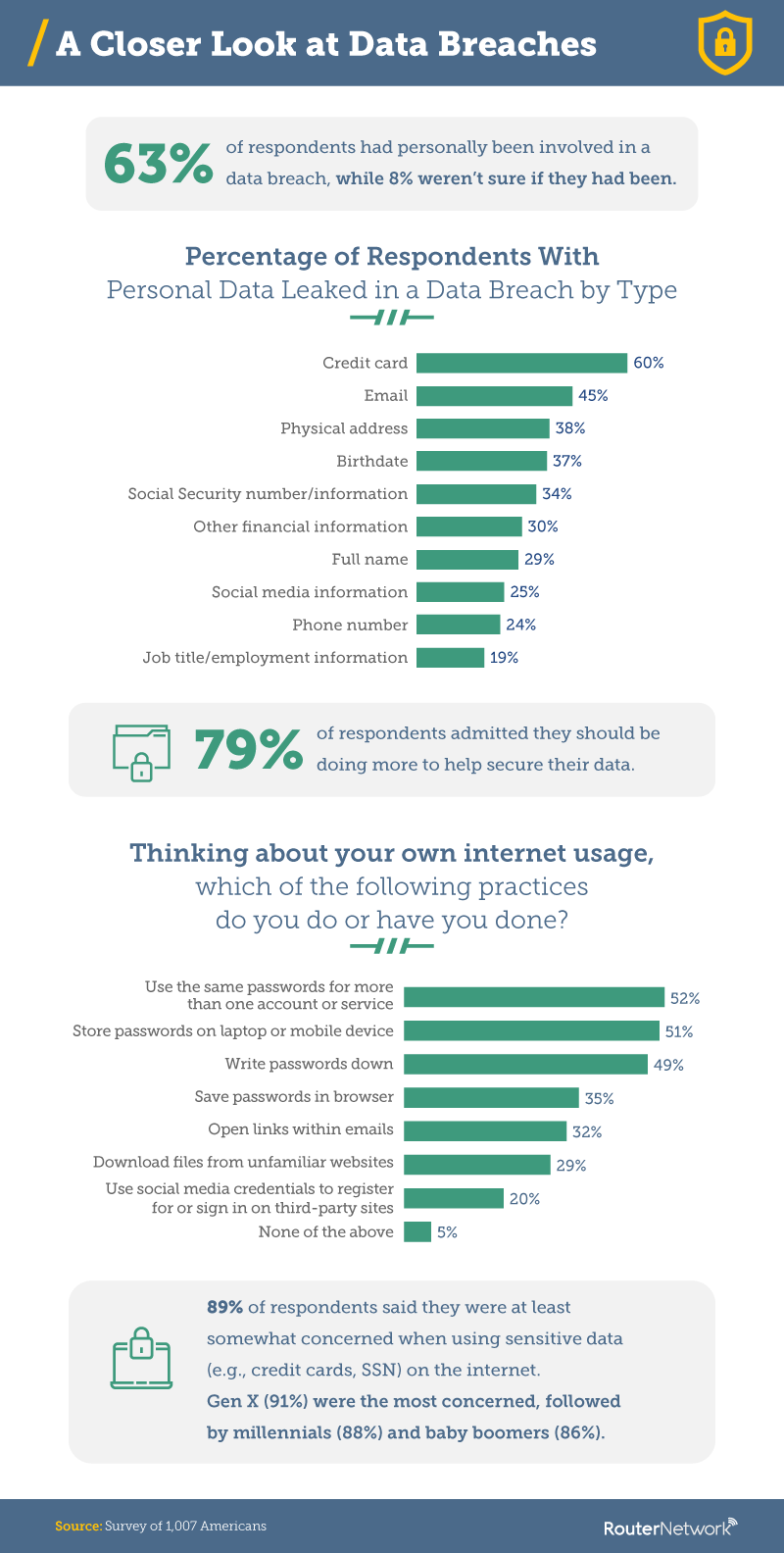 Even though respondents took time to secure their data online, 64% felt they’d be more likely to incur additional data breaches in the future. The top five habits of people that have not had data leaked included the following: