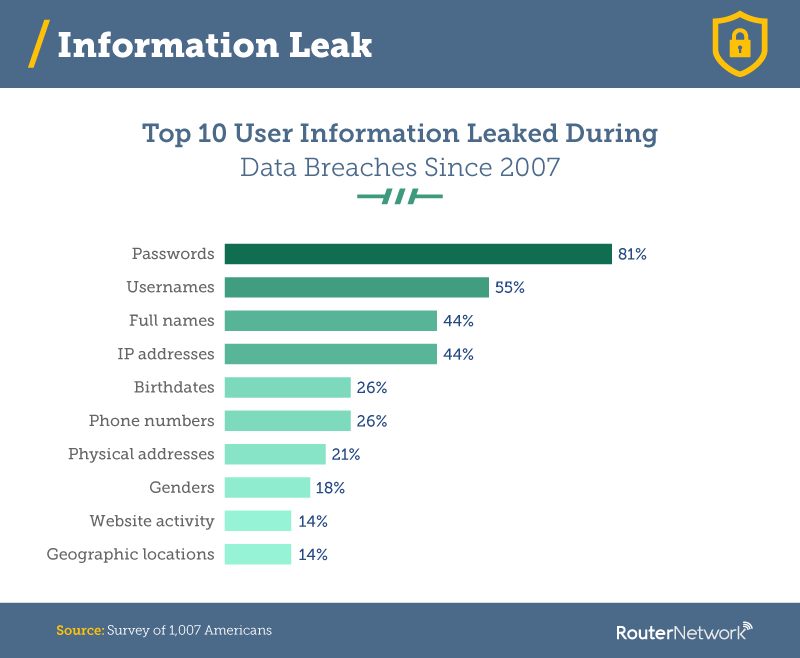 Passwords (81%) are the number one thing leaked via data breaches, making it even more essential to add frequent password changes to the top of your internet security checklist. Usernames, full names, and IP addresses were also commonly breached. Website activity and geographic location were less likely. But these are already commonly tracked through social media and other apps to be sold to third parties.