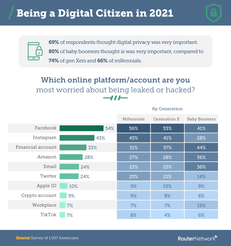 Across generations, most agreed (69%) that digital privacy is very important. But baby boomers valued their digital privacy (80%) higher than younger generations, demonstrated through less social media use and lower instances of falling victim to a data breach. Millennials and Gen Xers were most worried about a Facebook hack, possibly due to the commonality of them – Facebook and Yahoo breaches are responsible for impacting the largest number of people.