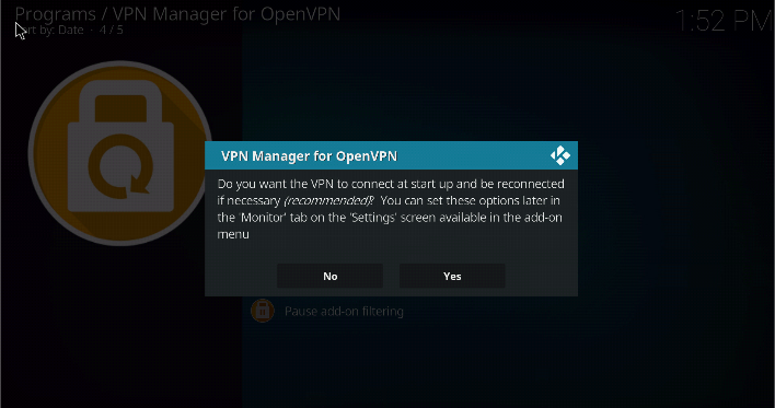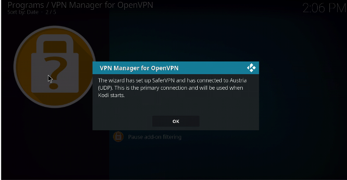As per the prompt, you are all set up with your new VPN, which will connect each time Kodi is opened. Now that your VPN is in place, your internet service provider or anyone else with access to your network, won’t be able to understand the traffic that is coming to and going from your device, as data gets sent through the SSL socket.