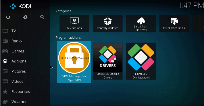With VPN Manager for OpenVPN selected, click install. After the installation is performed, you will find the new addon in the Add-ons menu.