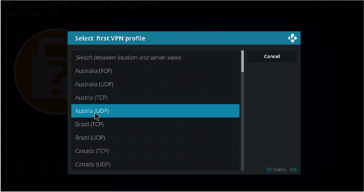 Now, LibreELEC will start downloading the .crt files and configuration preferences of your VPN service. Among these files will be a list of remote servers. This list will allow you to select where you would like your connection to appear to be coming from. For this example, we will choose Austria.