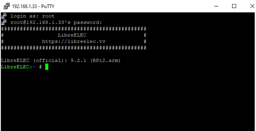 First, open your SSH client, such as the recommend PuTTY linked above. With your client open, enter the login details. Login as root and enter the password you set when you enabled the SSH setting in the LibreELEC wizard. Ensure the IP address shown is the same as the one you were shown previously. For this example, our IP address is shown as 192.168.1.33. After inputting the login details, your SSH client should look something like this.