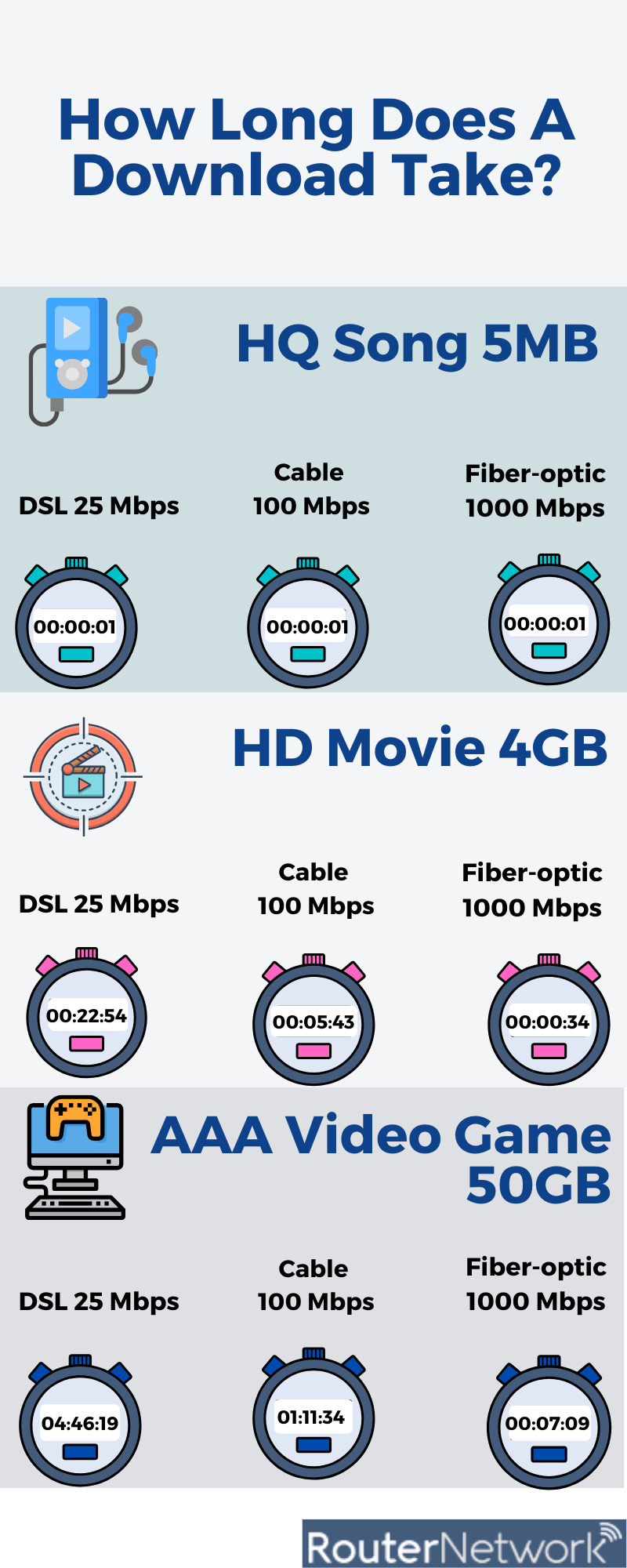 We've shown you the types of speeds you'll need for streaming video, but we haven't talked about downloading content yet. As long as you can stream video faster than is needed to play it, then faster speeds aren't much benefit unless someone else is also streaming. Downloads are different, faster speeds will always result in faster downloads. Let's take a look at three common downloads and see how long a few of the services mentioned will take to complete it.