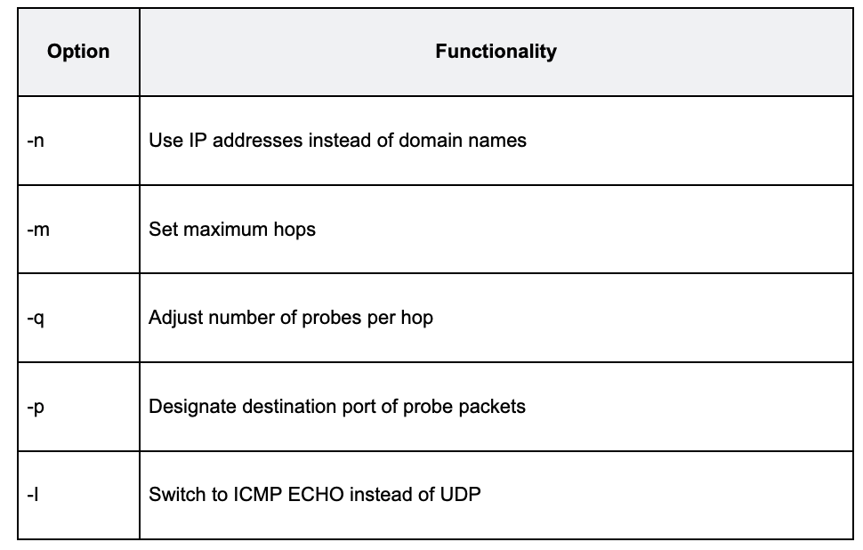 For example, to perform a traceroute using ICMP packets to google.com and display numeric addresses, you would use: